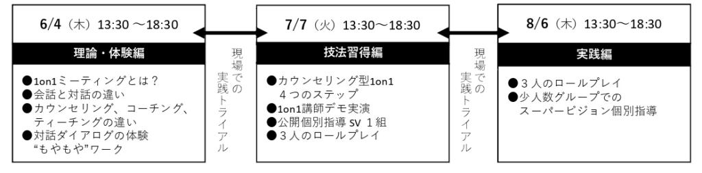 1on1ミーティングとは「上司と部下により週1回〜隔週1回程度行う定期的な1対1の対話」のことです。 職場で行われるコミュニケーションのほとんどは上司が部下へ“指示命令し答を教える”ティーチング。もしくは “質問することで部下に考えさせながら目標達成を支援する”コーチング のいずれかです。 本ワークショップでは「受容・共感しながら部下の感情および信念・価値観に焦点を合わせて聴く」ことにより「心 理的安全性の実現」と「全人格的な成長」を支援する“カウンセリング型1on1”の理論と技法を身につける内容です。